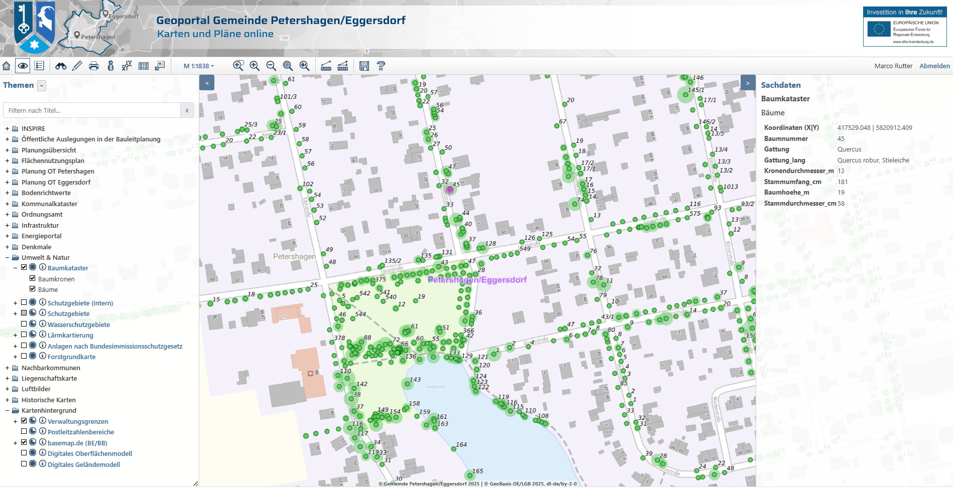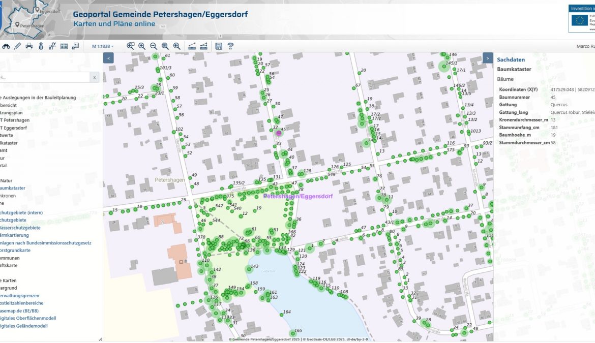 Die Verwaltung unserer mehr als 12.000 Straßenbäume wird so erheblich erleichtert. Im nächsten Schritt werden dem System auch die gut 5.000 Bäume hinzugefügt, welche auf gemeindlichen Grundstücken stehen. Ob eine Lücke ein echter Pflanzplatz ist oder etwa im Untergrund Leitungen stören, wird perspektivisch die digitale Verknüpfung mit den Daten der Ver- und Entsorger offenbaren. Bereits eingelesen sind hierfür die Leitungsdaten des Wasserverbandes, was erste Erfahrungen mit dem Datenabgleich erlaubt.