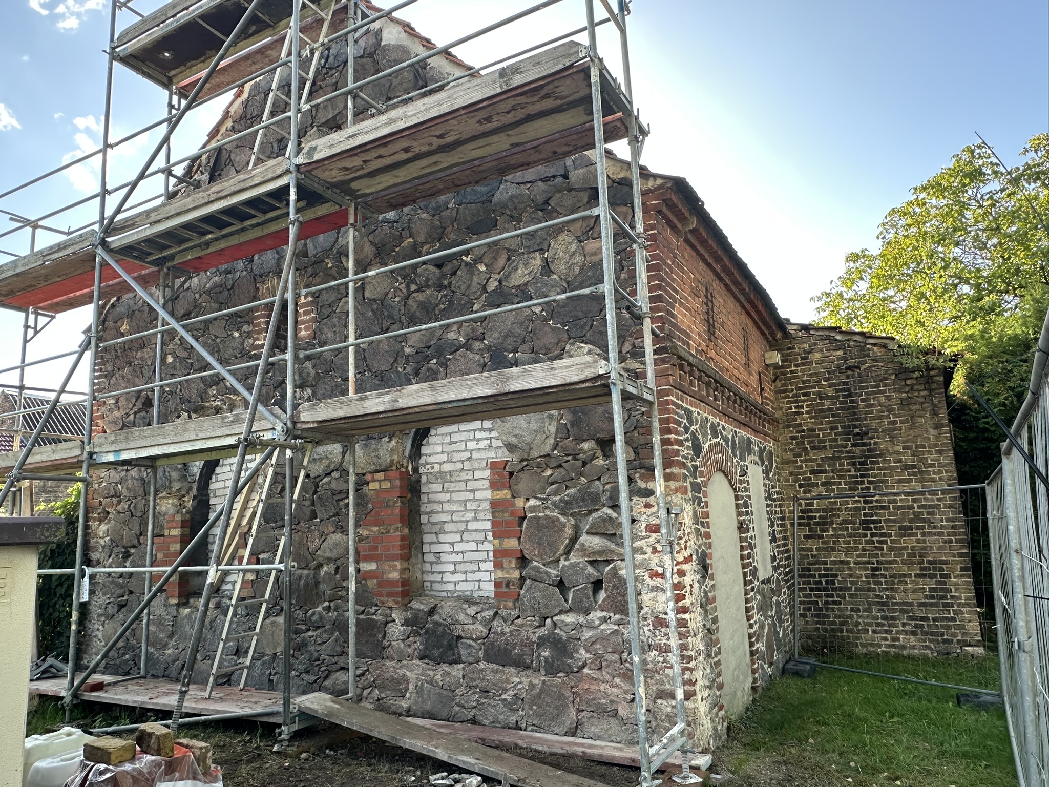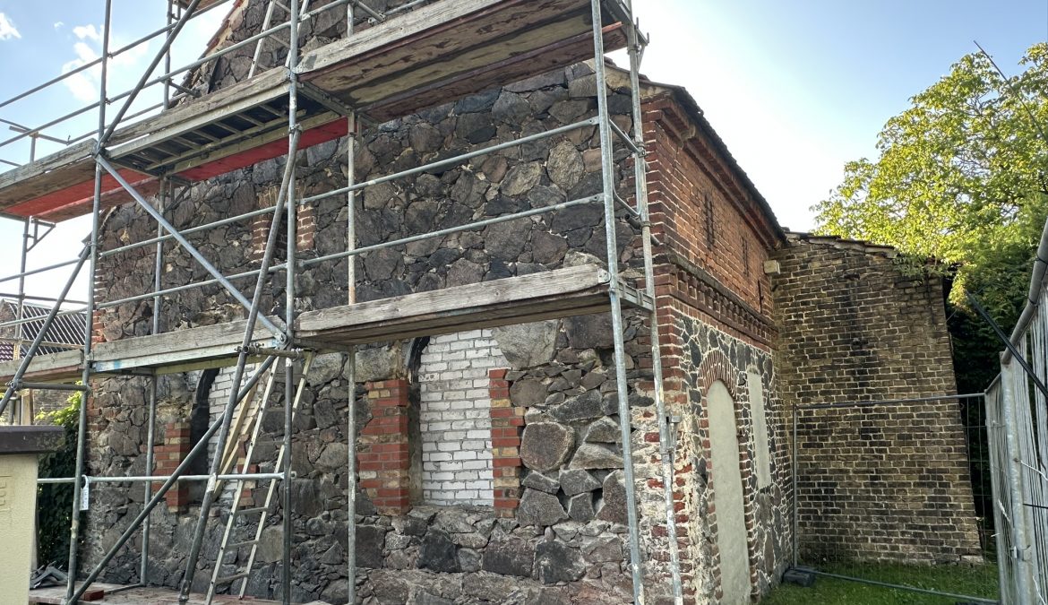Ein Baugerüst ist jüngst an der alten Schmiede in der Lindenstraße zu sehen. Der im vorigen Jahr durch die Gemeindevertretung beschlossene Bebauungsplan für das Areal hat das historische Bauwerk gesichert und städtebaulich als prägendes Element aufgegriffen. Die Jahre der Vernachlässigung haben deutliche Spuren hinterlassen und so weist das aus Feldsteinen errichtete Zwickelmauerwerk an vielen Stellen schon Lücken auf. Beim Zwickeln müssen die Lücken möglichst vollständig und kraftschlüssig ausgefüllt werden, um so einen stabilen Verbund zu erzeugen.