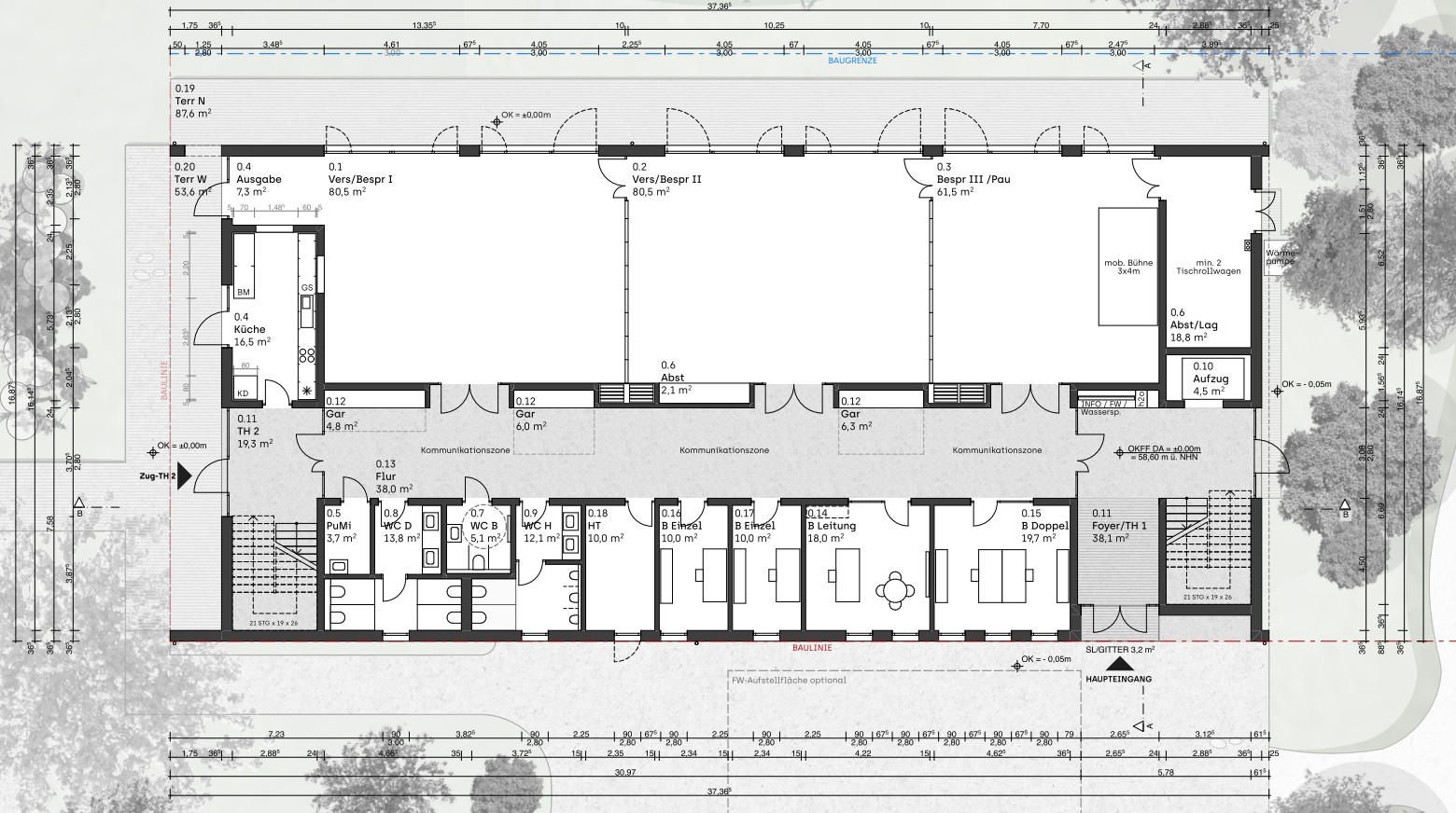 Das flexible und auf Energieeffizienz ausgerichtete Gebäude soll neuen Idee Raum geben und vielfältige kulturelle Angebote ermöglichen. Vom Parkplatz aus und über den Vorplatz führt der Weg ins Foyer und in in die Kommunikationszone mit integrierter Garderobe. Die sich anschließenden Veranstaltungsräume können einzeln oder als größere Fläche übergreifend genutzt werden. Ob mehrere Vereinssitzungen zeitgleich, Hochzeiten oder Geburtstage neben einer Teamsitzung oder Konzerte und Filmvorführungen im großen Saal, das Raumkonzept lässt sich auf viele Formate und Anlässe anpassen. Bodentiefe Fenster gestatten den Blick ins Grüne und über den Mühlenteich. Holzverkleidungen und Parkettboden vermitteln ein warmes und wohnliches Gefühl. Das angebundene Stuhllager verfügt über einen Zugang von außen und kann so auch als Künstlergarderobe oder Requisitenraum genutzt werden. Sollen Speisen und Getränke gereicht werden, dann bietet die Catering-Küche dafür optimale Bedingungen. Zugang bietet der Saal auch zur links- und rückseitigen Terrasse, was gerade im Sommer die Möglichkeiten nochmals erweitert.